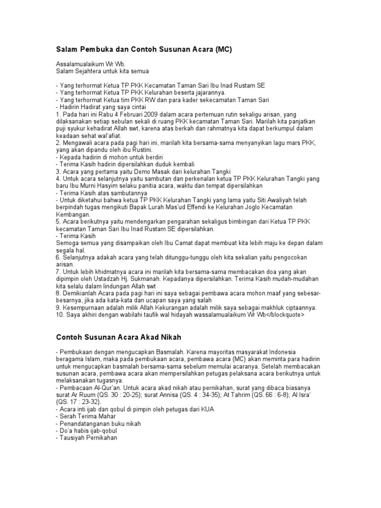 Contoh Salam Pembuka Dan Susunan Acara Mc